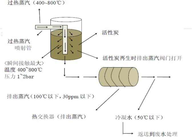 活性炭经过一定时间过水后,活性炭吸附去除率下降,出水COD超标。这时就需要停止过水,同时启动备用活性炭罐吸附制水,停止向需要再生的活性炭罐通水,启动过热蒸汽发生器,通过炭罐内预埋的蒸汽加热系统,向罐内活性炭层通入400~800°C过热蒸汽,罐内活性炭层温度持续上升至设定温度;保温一定时间,活性炭所吸附的污染物被高温脱附并活化再生。